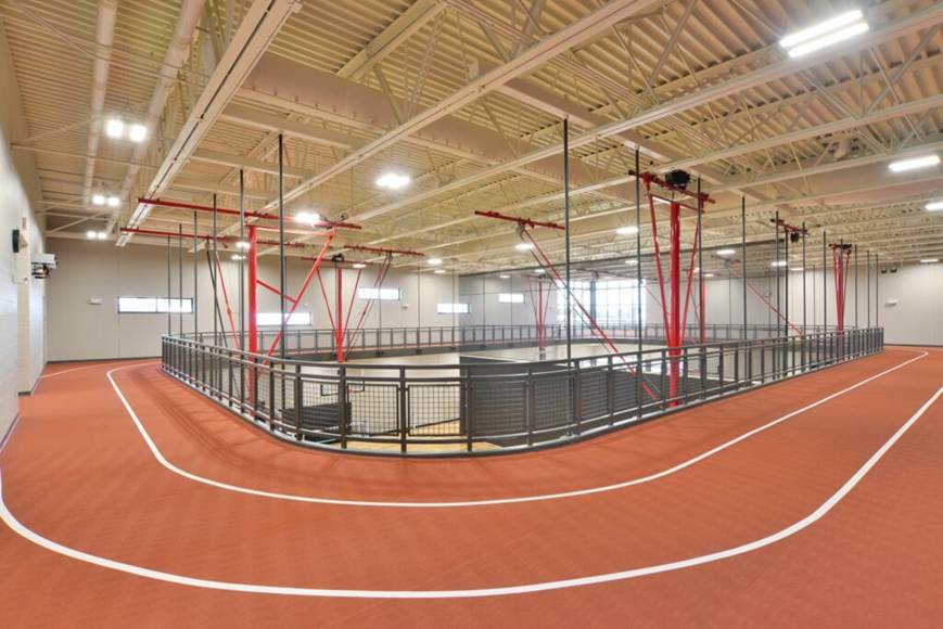 fitness center, a group fitness studio, gymnasium with an indoor track, and
