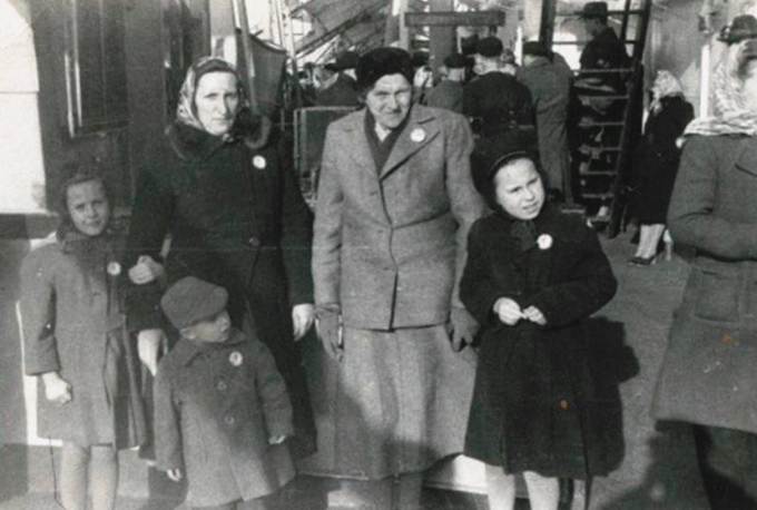 One night Mary (age 9) fell off the upper bunk bed onto the floor and had some bruising on my side. It had to be kept secret to avoid being prevented from sailing. We were loaded onto the USS General Harry Taylor for their trip to New York. Women and children got cabins, single women had quarters on the lower level. Her grandmother was sent to the lower level, but her mother snuck her back to stay with them. They tied scarves to bunk beds to keep them from sliding from side to side. The men were at the back lower part of ship, they had to work swabbing the deck and kitchen work. Most of the passengers were seasick. Lots of food was prepared for Thanksgiving, but few could eat. Daily drills to make sure people knew how and where to go in case of emergency.
